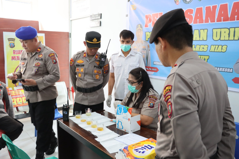 Kapolres Nias, AKBP Agung, dan Waka Polres Nias, Kompol SK. Harefa mendapat giliran pertama dilakukan tes urine, kemudian disusul personel lainnya.