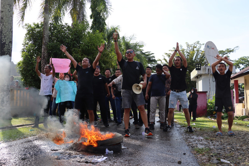 Peragaan massa aksi membakar ban saat simulasi Sispam Mako Polres Nias. [WAHANANEWS/Ist]